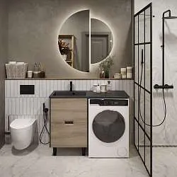 Функциональная и стильная столешница в востребованной и актуальной стилистике LOFT. Минималистичная и одновременно эффектная, она изготовлена в универсальной прямоугольной форме и дополнена такими практичными деталями, как металлические кронштейны, которые можно использовать в качестве рейлингов. Столешница выполнена из проверенных материалов, прекрасно защищена от воздействия влаги, не склонна к появлению сколов, царапин, трещин и других дефектов. Она подойдет для ванных комнат любых размеров и практически любой цветовой гаммы - от сдержанной до яркой и насыщенной.